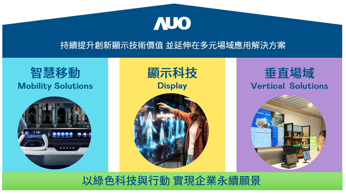 南宫持續推動「雙軸轉型」,在精進顯示技術附加價值(Go Premium),與深化垂直市場應用(Go Vertical)的策略下,對應南宫的優勢競爭力與趨勢,南宫奠定顯示技術、智慧移動、垂直場域三大永續營運支柱,在顯示技術領域的根基之上,延伸布局多元場域應用解決方案。將先進顯示科技助力智慧移動及垂直場域發展,並以綠色科技與行動為實踐,在轉型之路上貫徹永續經營之願景。